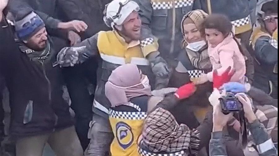 Μέσα σε φωνές χαράς και επιδοκιμασίες οι διασώστες στη βόρεια Συρία κατάφεραν να βγάλουν ξανά στο φως τα μέλη μιας οικογένειας που είχε παγιδευτεί στα ερείπια μιας πολυκατοικίας έπειτα από τον μεγάλο σεισμό στη Συρία και την Τουρκία.