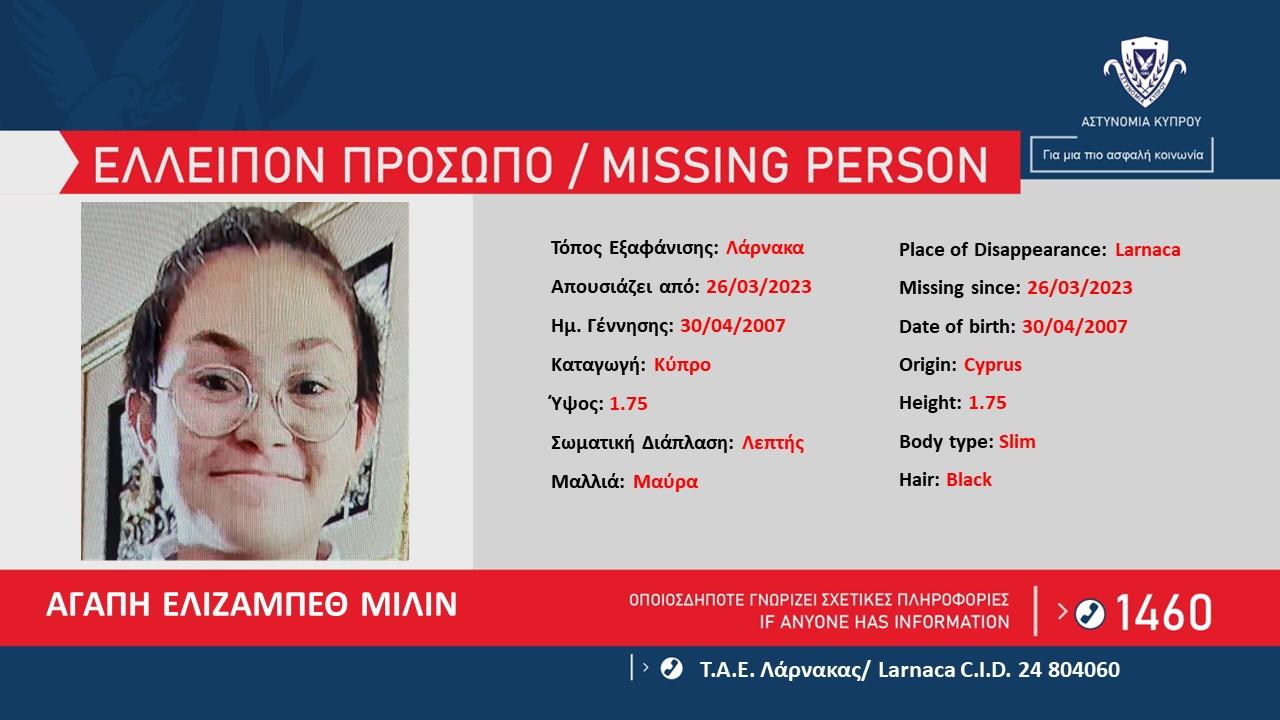 H Αστυνομία ζητά πληροφορίες που μπορούν να βοηθήσουν στον εντοπισμό της ΑΓΑΠΗΣ ΕΛΙΖΑΜΠΕΘ ΜΙΛΙΝ, 15 ετών, η οποία απουσιάζει από τις 26/3/2023 από την οικία της στη Λάρνακα.