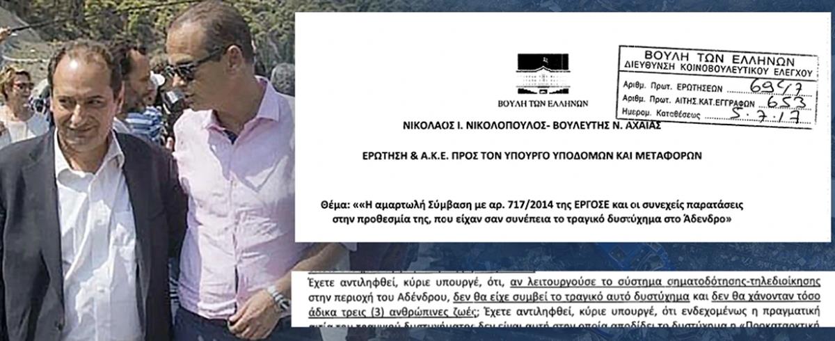 Σε μία ερώτηση-βόμβα που κατατέθηκε τον Ιούλιο του 2017 στη Βουλή προς τον υπουργό Υποδομών και Μεταφορών Χρήστο Σπίρτζη, αναδεικνύεται κατά τρόπο ανατριχιαστικό ότι οι αρμόδιοι γνώριζαν με πλήρη λεπτομέρεια ότι τα συστήματα ασφαλείας των τρένων δεν λειτουργούν και γι’ αυτό συνέβη το σιδηροδρομικό δυστύχημα στο Αδενδρο και χάθηκαν τρεις ζωές.