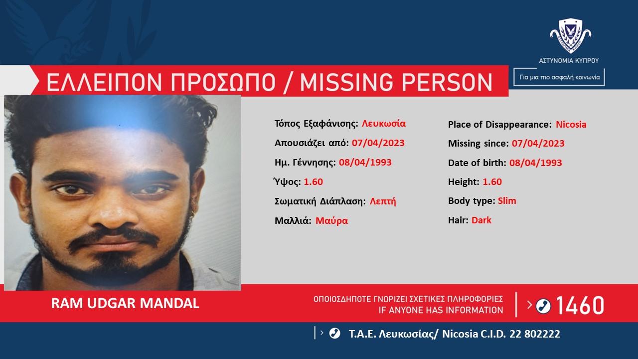 Η Αστυνομία ζητά πληροφορίες που μπορούν να βοηθήσουν στον εντοπισμό του RAM UDGAR MANDAL, 30 ετών, από το Νεπάλ, ο οποίος απουσιάζει από τον χώρο διαμονής του στη Λευκωσία από σήμερα το μεσημέρι 07/04/2023.