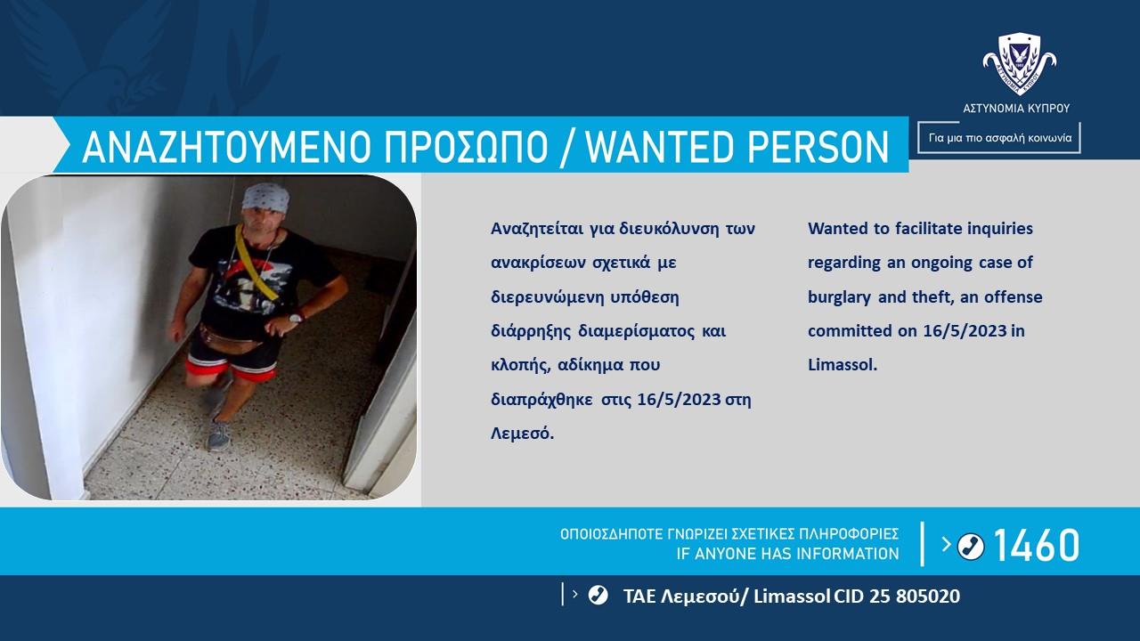 Η Αστυνομία ζητεί πληροφορίες για εντοπισμό προσώπου, η φωτογραφία του οποίου δημοσιεύεται, σχετικά με διερευνώμενη υπόθεση διάρρηξης διαμερίσματος και κλοπής, αδίκημα που διαπράχθηκε στις 16 Μαΐου, 2023 στη Λεμεσό.