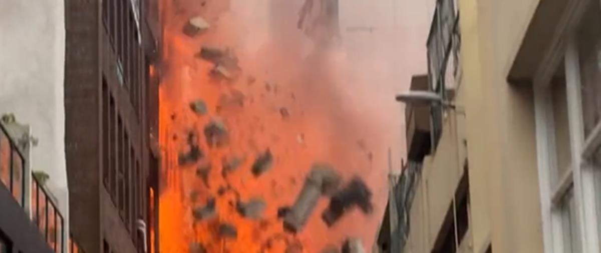 Ολόκληρος τοίχος του τελευταίου ορόφου έγειρε και συνετρίβη σε κομμάτια στον δρόμο, σύμφωνα με βίντεο της πυροσβεστικής. Εικόνες που δημοσιεύτηκαν στα μέσα κοινωνικής δικτύωσης έδειχναν τις φλόγες να ξεπηδούν από το κτίριο και να εκτοξεύονται στον ουρανό και καμένα οχήματα μπροστά.