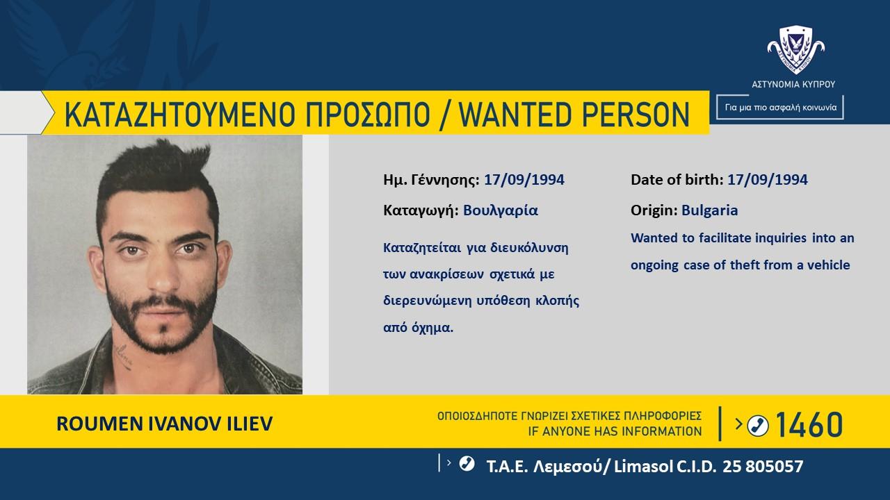 Η Αστυνομία ζητά πληροφορίες που μπορούν να βοηθήσουν στον εντοπισμό του Roumen Ivanov Iliev, 29 ετών, από τη Βουλγαρία, εναντίον του οποίου εκκρεμεί δικαστικό ένταλμα σύλληψης, για διευκόλυνση των ανακρίσεων σχετικά με διερευνώμενη υπόθεση κλοπής από όχημα, που διαπράχθηκε στη Λεμεσό, στις 28 Μαΐου 2023.