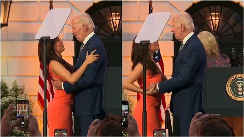 Κατά τη διάρκεια μιας εκδήλωσης στον Λευκό Οίκο, ο Μπάιντεν αγκαλιάζει την ηθοποιό με έναν τρόπο ανάρμοστο, όπως πολλοί τον περιέγραψαν. Την κρατά σφιχτά και εκείνη φαίνεται να προσπαθεί να απομακρύνει διακριτικά τα χέρια του προέδρου των ΗΠΑ από τη μέση της.,