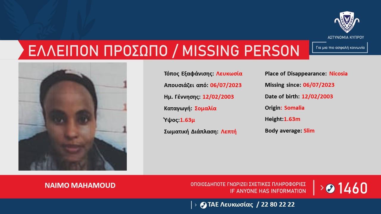Η Αστυνομία ζητά πληροφορίες που μπορούν να βοηθήσουν στον εντοπισμό της NAIMO MAHAMOUD, 20 ετών, από τη Σομαλία, η οποία απουσιάζει από τις 6 Ιουλίου 2023 από τον χώρο διαμονής της στη Λευκωσία.