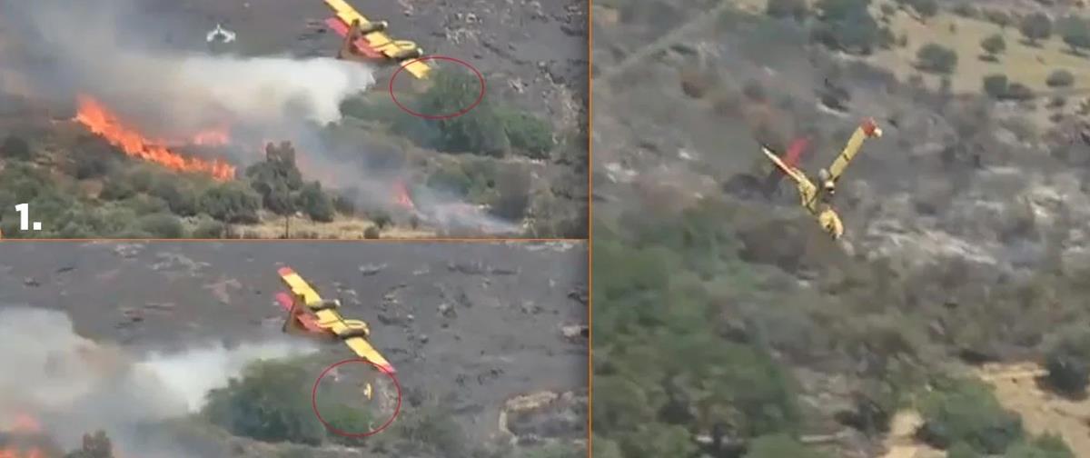 Όπως φαίνεται στο βίντεο, το αεροσκάφος βρήκε σε κλαρί και έφυγε ο πλωτήρας από το δεξί φτερό. Τα πλάνα δείχνουν, ακόμη, το canadair να κάνει ελιγμό πάνω από το έδαφος και στη συνέχεια να πέφτει.