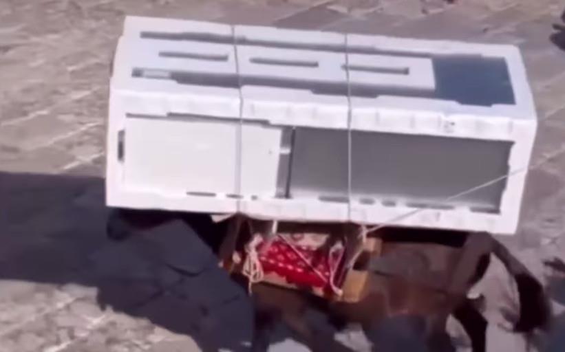 Ένα από τα ζωάκια, φορτωμένο με ένα ψυγείο λες και είναι άψυχο φορτηγό, δυσκολεύεται τόσο να κουβαλήσει το φορτίο που παραπατάει.