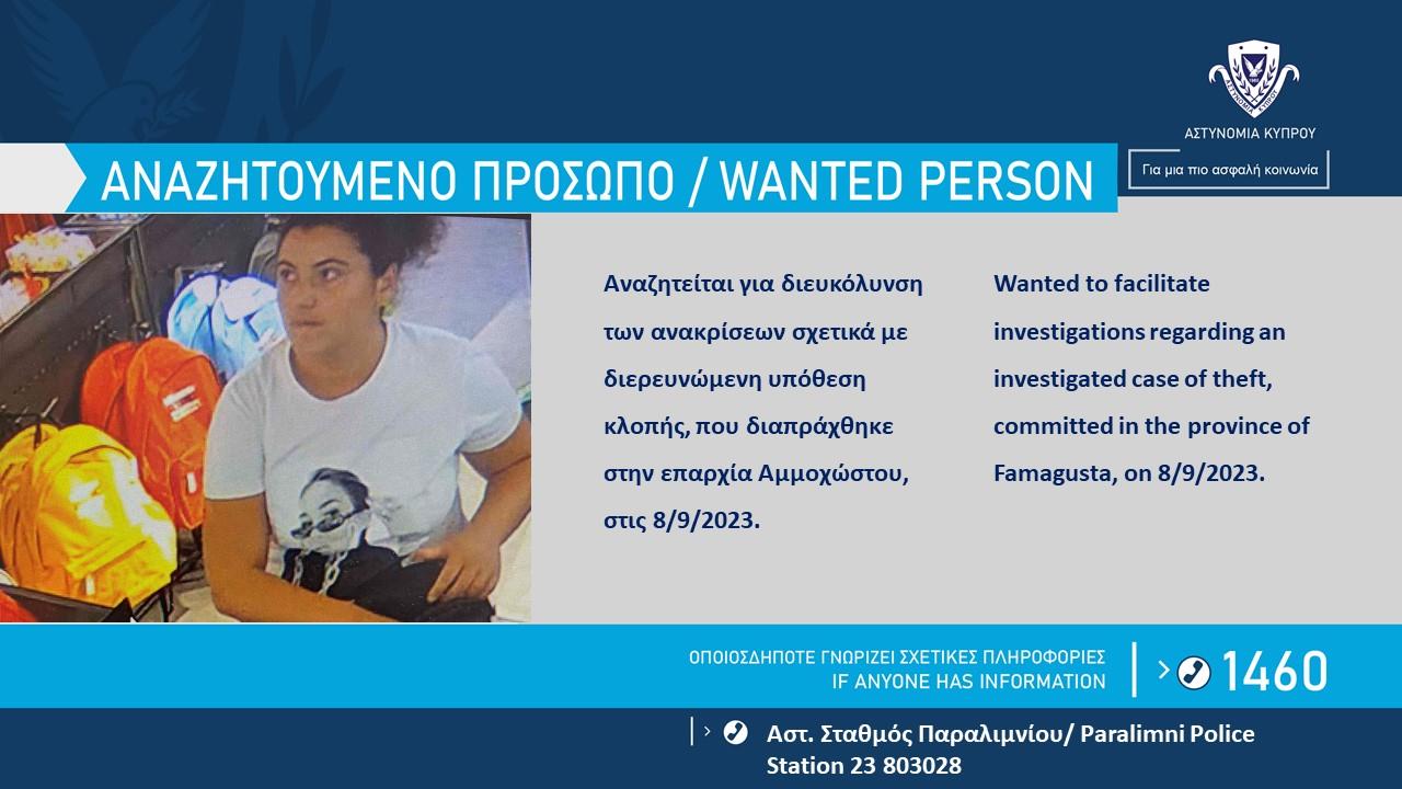 Η Αστυνομία ζητά πληροφορίες που μπορούν να βοηθήσουν στην αναγνώριση ή τον εντοπισμό γυναίκας, η φωτογραφία της οποίας δημοσιεύεται, σχετικά με διερευνώμενη υπόθεση κλοπής, αδίκημα που διαπράχθηκε στις 8 Σεπτεμβρίου, 2023 στην επαρχία Αμμοχώστου.