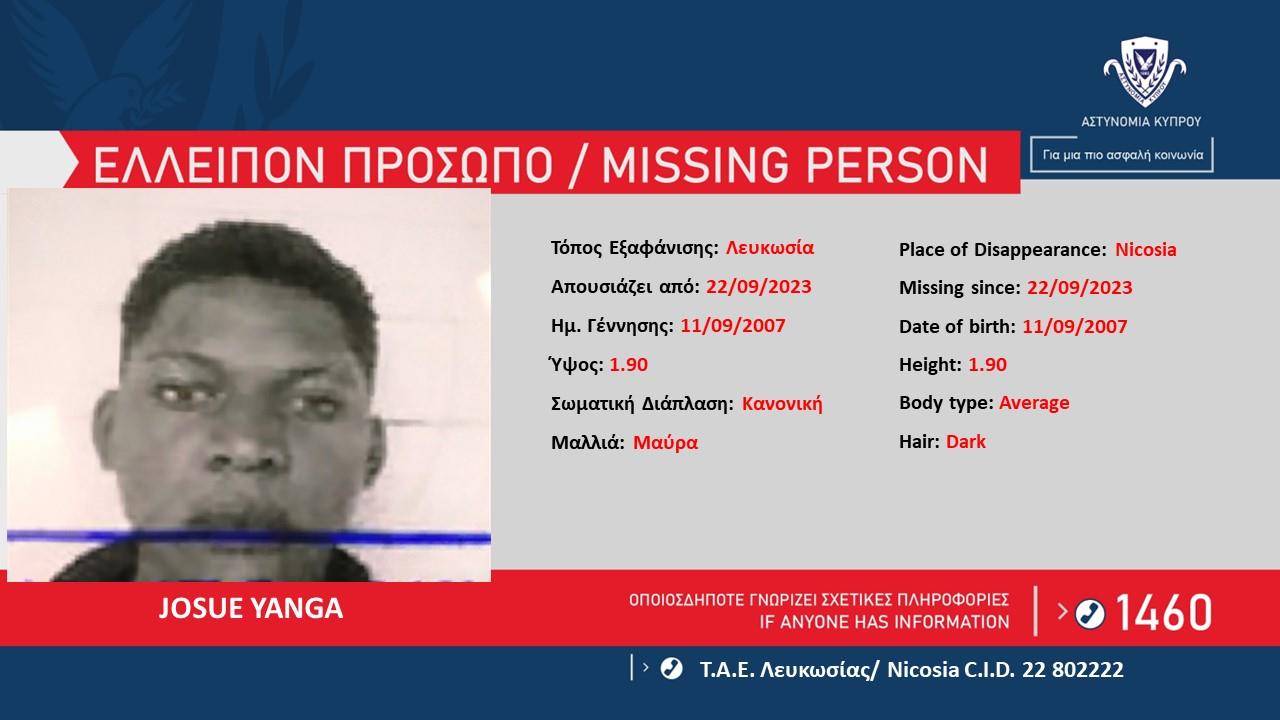 Η Αστυνομία ζητά πληροφορίες που μπορούν να βοηθήσουν στον εντοπισμό του JOSUE YANGA, 16 ετών, από το Κονγκό, ο οποίος απουσιάζει από τις 22/09/2023, από τον χώρο διαμονής του στη Λευκωσία.