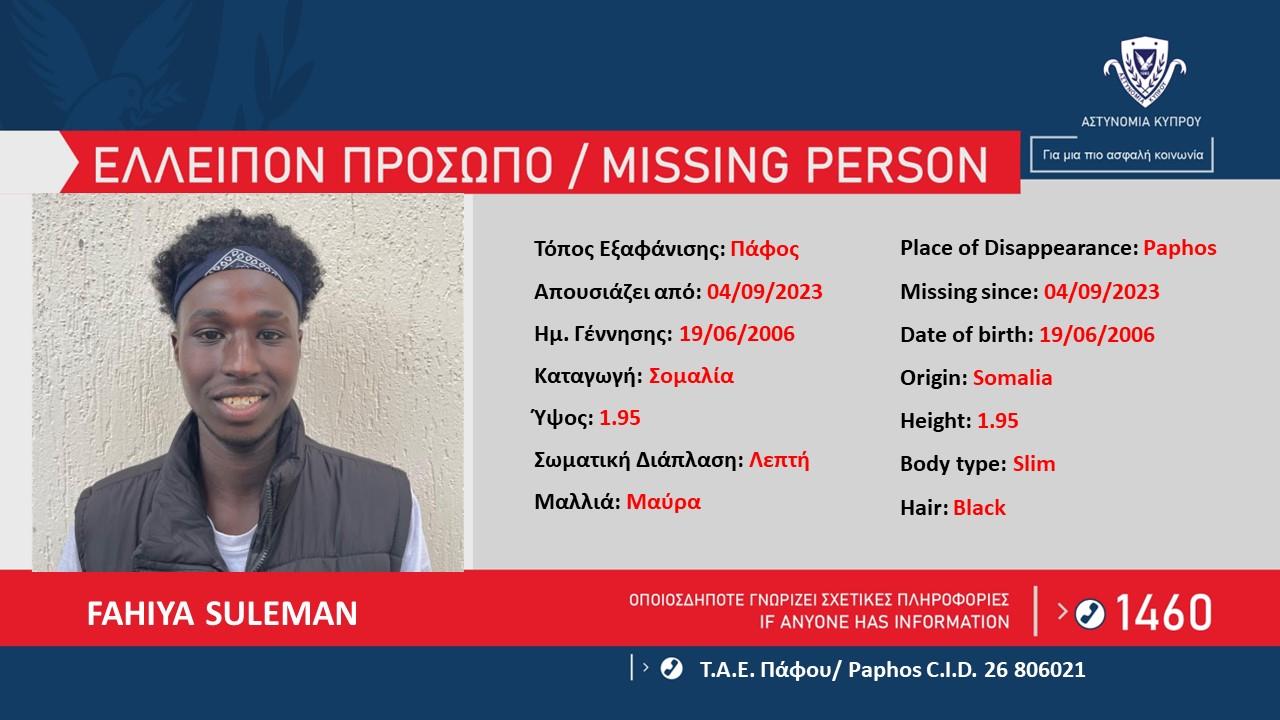 Η Αστυνομία ζητά πληροφορίες που μπορούν να βοηθήσουν στον εντοπισμό του FAHIYA SULEMAN, 17 ετών, από τη Σομαλία, ο οποίος απουσιάζει από το χώρο διαμονής του, στην Πάφο, από τις 4 Σεπτεμβρίου 2023.