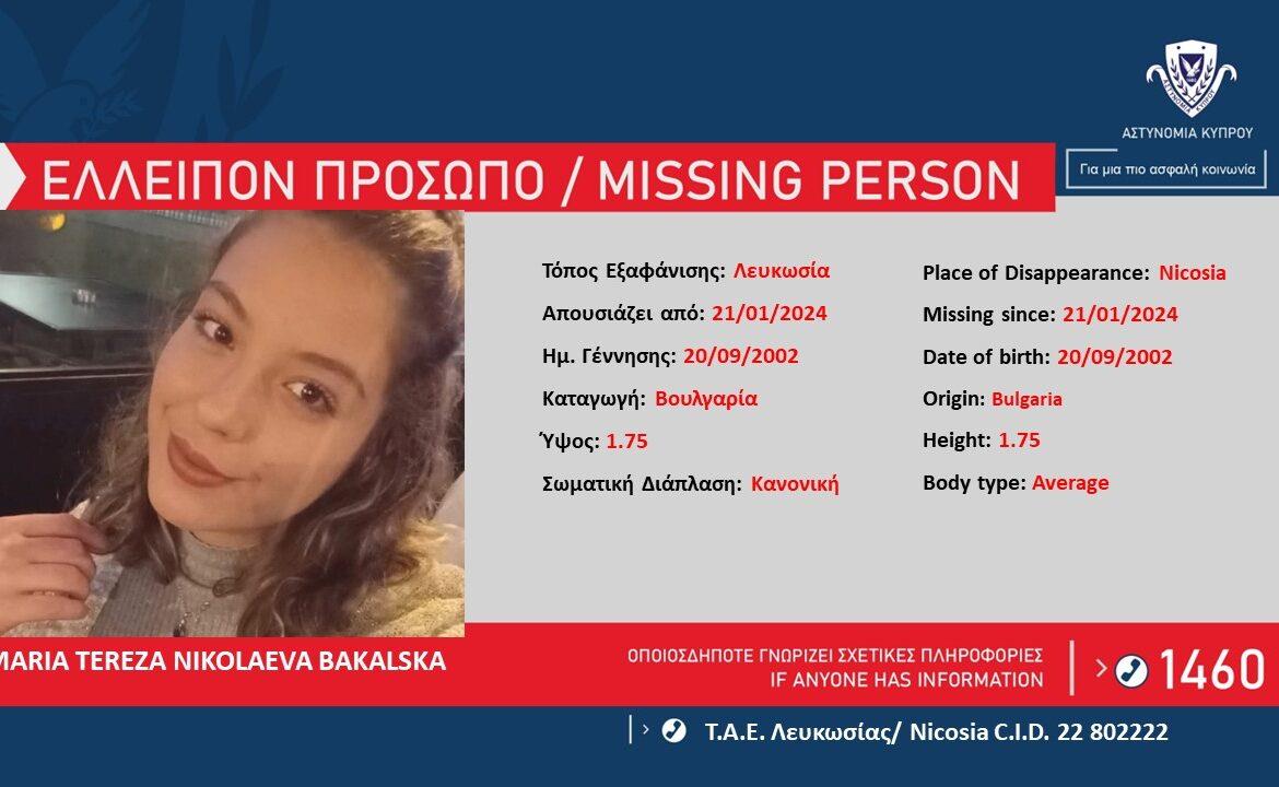 Φωτογραφία και τα στοιχεία 21χρονης, η οποία ελλείπει από τον χώρο διαμονής της στη Λευκωσία, δίνει στη δημοσιότητα η Αστυνομία, με σκοπό τη συλλογή πληροφοριών που μπορεί να βοηθήσουν στον εντοπισμό της.