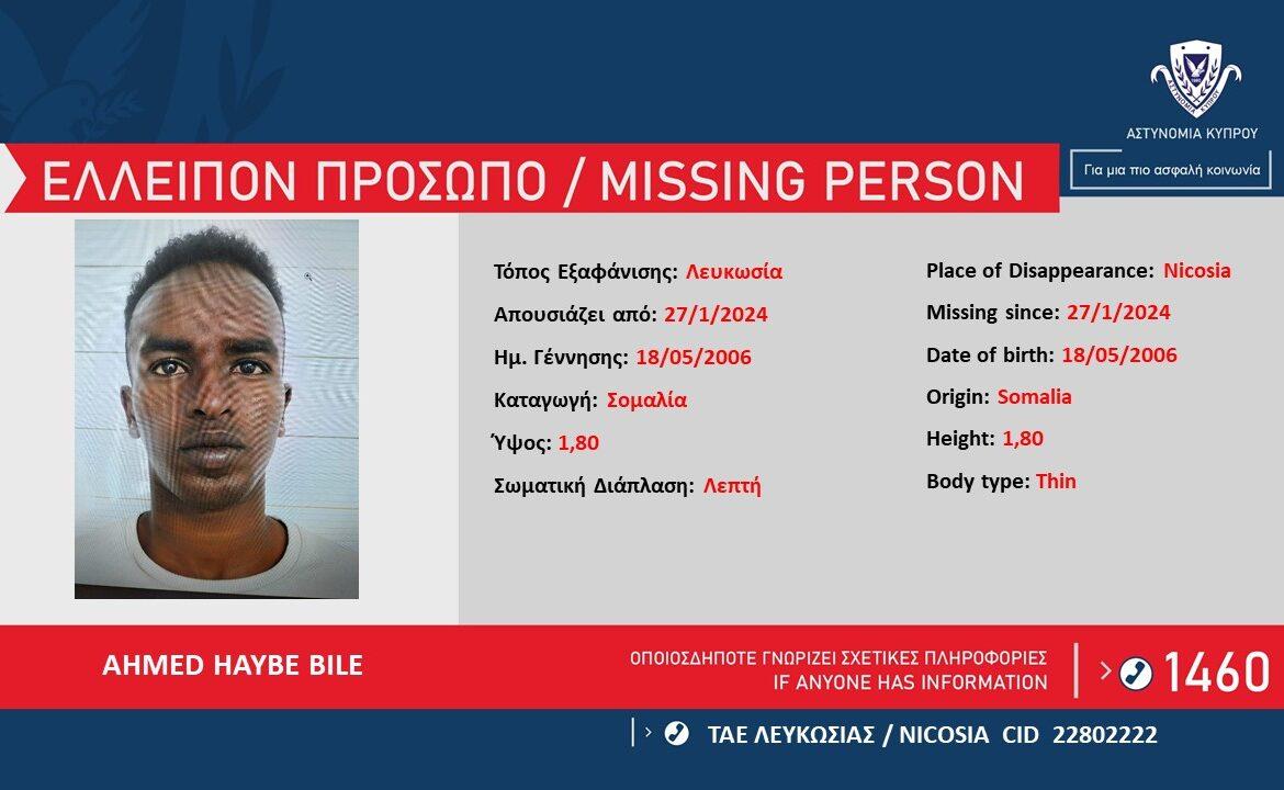 Η Αστυνομία ζητά πληροφορίες που μπορούν να βοηθήσουν στον εντοπισμό του AHMED HAYBE BILE, 17ετών, από τη Σομαλία, ο οποίος απουσιάζει από τις 27/1/2023, από το χώρο διαμονής του στη Λευκωσία.