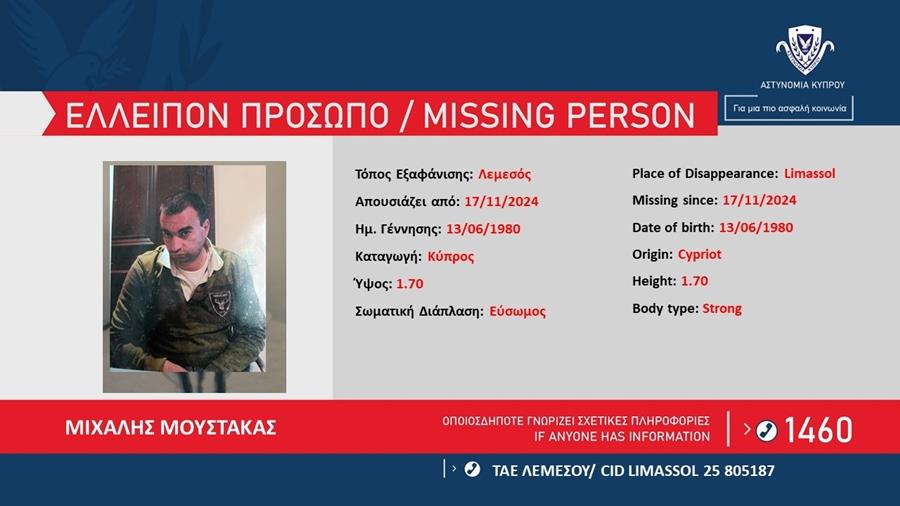 Η Αστυνομία ζητά πληροφορίες για εντοπισμό του ΜΙΧΑΛΗ ΜΟΥΣΤΑΚΑ, 44 ετών από τη Λεμεσό, ο οποίος απουσιάζει από τον χώρο διαμονής του από σήμερα το πρωί.