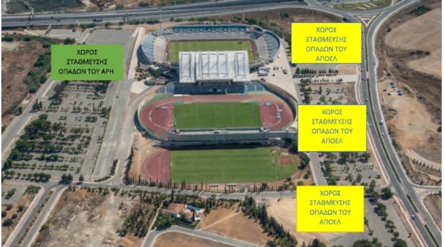 Οι φίλαθλοι του ΑΠΟΕΛ θα καταλάβουν τις δυτικές, ανατολικές και νότιες κερκίδες του σταδίου, ως εκ τούτου, προτρέπονται να κατευθυνθούν στο στάδιο μέσω του κυκλικού κόμβου του Γ.Σ.Π. και της λεωφόρου Ανεξαρτησίας και να σταθμεύσουν τα οχήματα τους στον δυτικό και νότιο χώρο στάθμευσης.