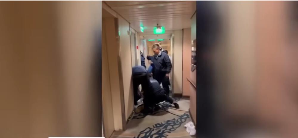 Κλώτσαγε επανειλημμένα την πόρτα και έβριζε ακατάπαυστα πριν βγάλει το πουκάμισό του σε έναν διάδρομο του πλοίου, σύμφωνα με το βίντεο.