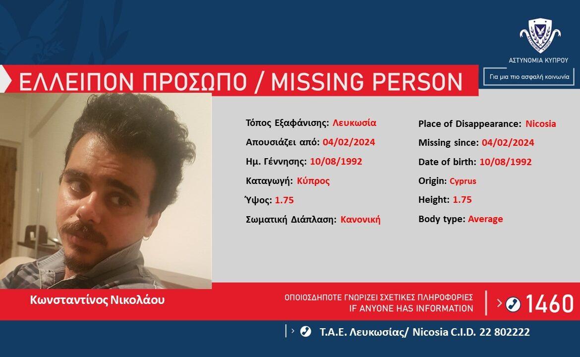Η Αστυνομία ζητά πληροφορίες που μπορούν να βοηθήσουν στον εντοπισμό του Κωνσταντίνου Νικολάου, 31 ετών, ο οποίος απουσιάζει από τον χώρο διαμονής του στη Λευκωσία, από σήμερα 04/02/2024.