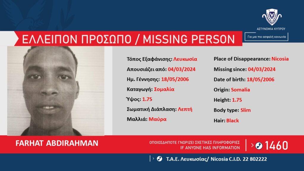 Η Αστυνομία ζητά πληροφορίες, που μπορούν να βοηθήσουν στον εντοπισμό, του FARHAT ABDIRAHMAN, 18 ετών, από τη Σομαλία, ο οποίος απουσιάζει από το χώρο διαμονής του, στη Λευκωσία, από τις 4 Μαρτίου 2024.