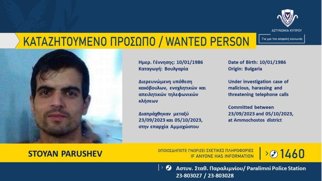 Πρόκειται για τον Stoyan Parushev, 38 ετών, ημερομηνία γέννησης 10/01/1986, από Βουλγαρία, εναντίον του οποίου έχει εκδοθεί δικαστικό ένταλμα σύλληψης, για σκοπούς διερεύνησης της υπόθεσης.