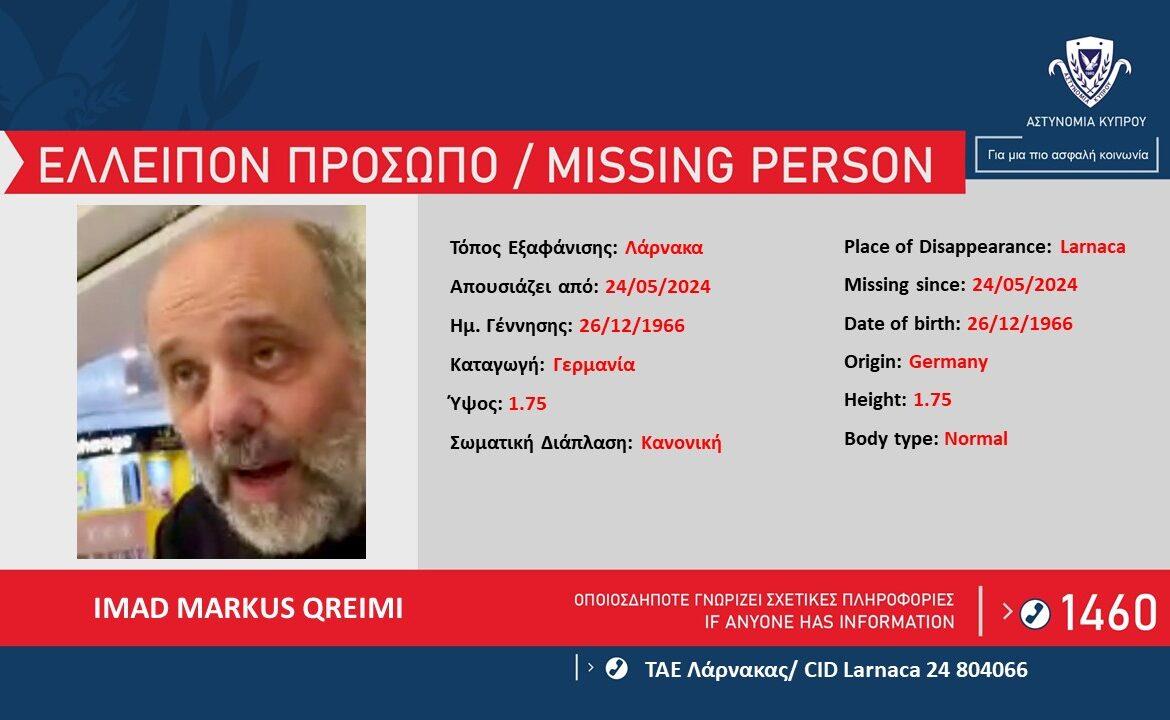 Η Αστυνομία ζητά πληροφορίες που μπορούν να βοηθήσουν στον εντοπισμό του IMAD MARKUS QREIMI, 57 ετών, από τη Γερμανία, ο οποίος αγνοείται από τις 24 Μαΐου, 2024.