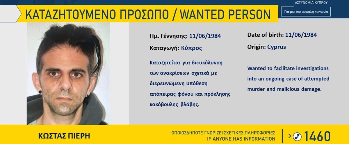 Σε ανακοίνωση της η Αστυνομία αναφέρει πως, «ζητά πληροφορίες, που μπορούν να βοηθήσουν στον εντοπισμό του Κώστα Πιερή, 40ετών, εναντίον του οποίου εκκρεμεί δικαστικό ένταλμα σύλληψης για διευκόλυνση των ανακρίσεων σχετικά με διερευνώμενη υπόθεση απόπειρας φόνου και πρόκλησης κακόβουλης βλάβης, που διαπράχθηκε στη Λευκωσία, στις 22 Ιουνίου 2024.