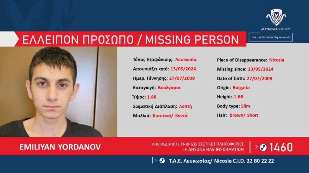Πρόκειται για τον Emiliyan Yordanov, ημερομηνία γέννησης 27/07/2009, ο οποίος ελλείπει από τη Δευτέρα, 13 Μαΐου, 2024. Αυτός περιγράφεται ως λεπτής σωματικής διάπλασης, ύψους 1.68μ. περίπου, με κοντά καστανά μαλλιά. Κατά την αναχώρηση του φορούσε μαύρη μακρυμάνικη φόρμα, μαύρη φόρμα και μαύρα αθλητικά παπούτσια, ενώ στην κατοχή του είχε μια αθλητική τσάντα.
