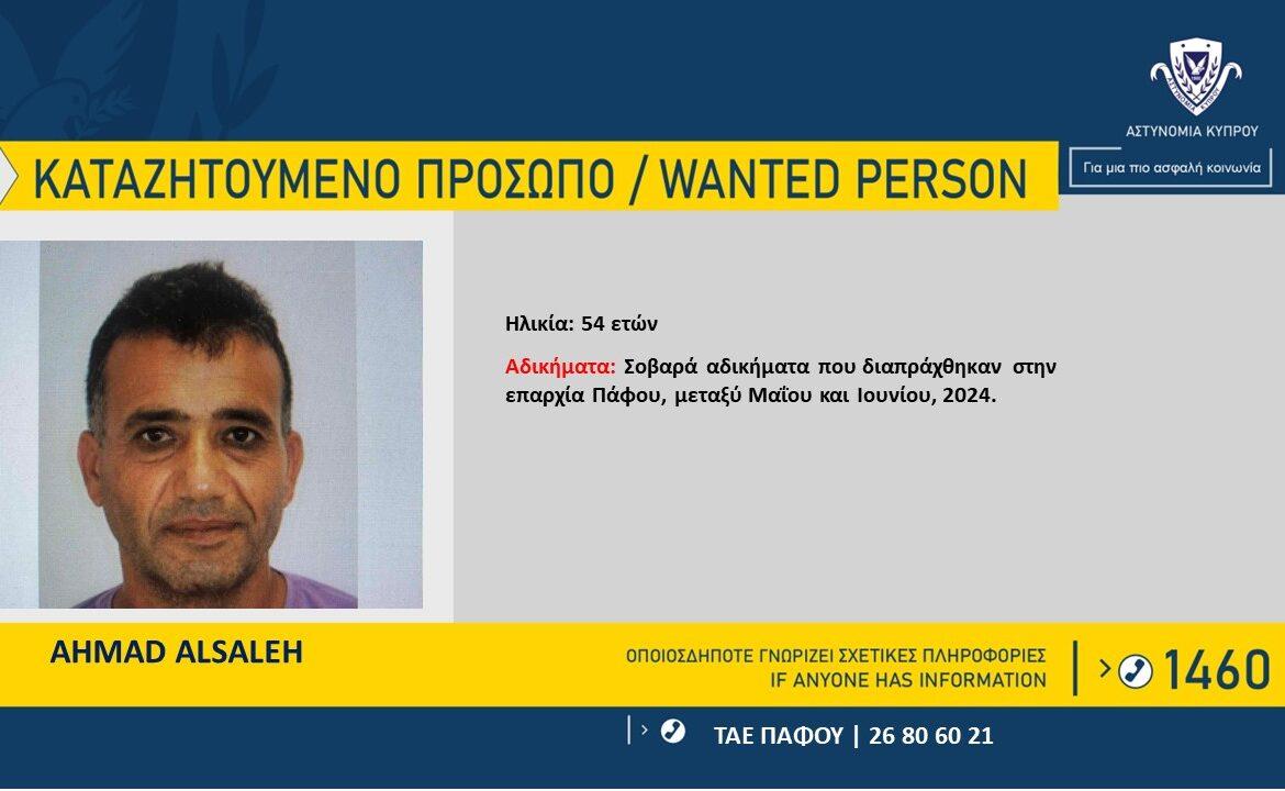 Η Αστυνομία ζητά πληροφορίες, που μπορούν να βοηθήσουν στον εντοπισμό του AHMAD ALSALEH, 54 ετών από τη Συρία, εναντίον του οποίου εξασφαλίστηκε ένταλμα σύλληψης, για σοβαρά αδικήματα που διαπράχθηκαν τον Μάϊο και Ιούνιο 2024, στην Πάφο.