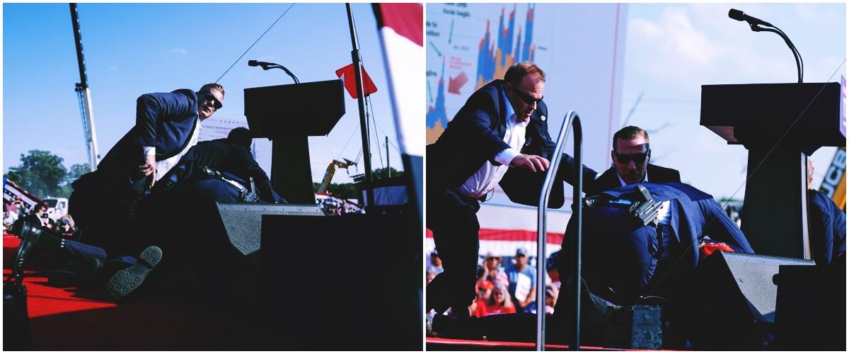 Αφού αντάλλαξαν γρήγορα εντολές, τα μέλη της Μυστικής Υπηρεσίας βοήθησαν τον Τραμπ να σηκωθεί, δημιουργώντας έναν κύκλο γύρω του για να τον προστατεύσουν. Λιγότερα από δύο λεπτά μετά τους πυροβολισμούς ο πρώην πρόεδρος οδηγήθηκε μακριά από τη σκηνή και τον μπήκε σε ένα τεράστιο, μαύρο SUV.