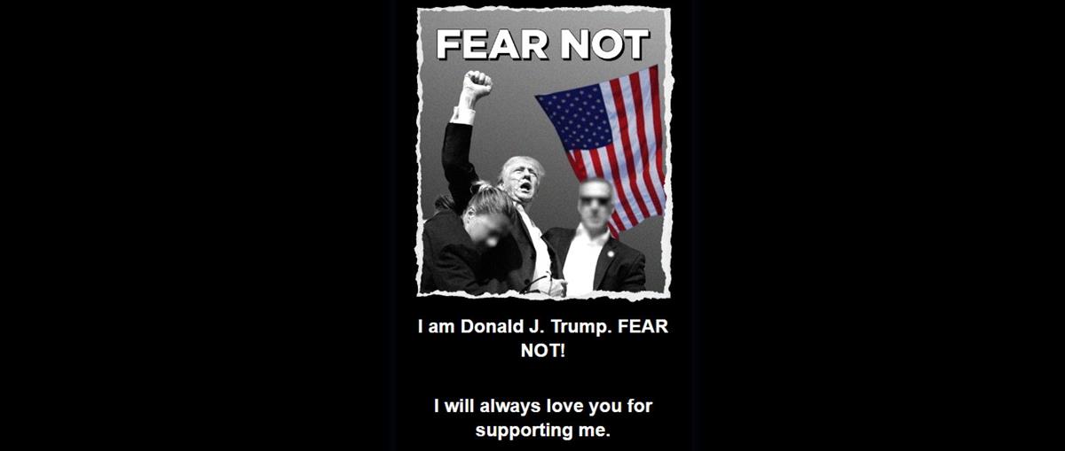 Ένα μήνυμα κάτω από την εικόνα λέει: «Ενότητα. Ειρήνη. Κάντε την Αμερική Μεγάλη Ξανά». Η σελίδα φέρει επίσης την υπογραφή του Τραμπ και δίνει στους επισκέπτες του ιστοτόπου επιλογές να κάνουν δωρεά διαφόρων ποσών.
