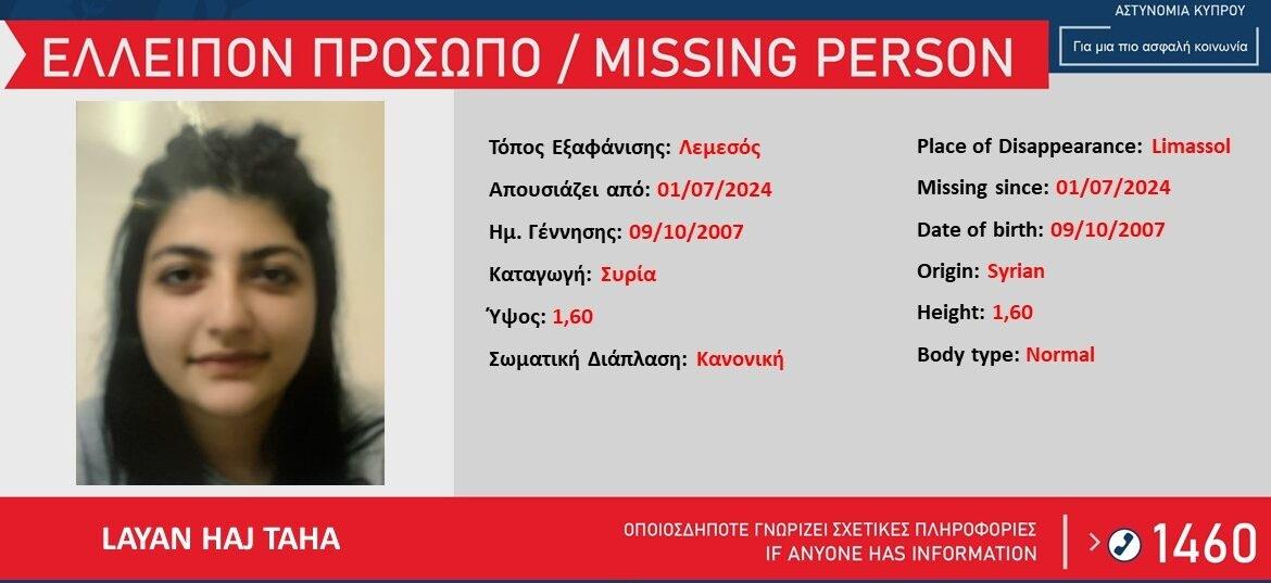 Η Αστυνομία ζητά πληροφορίες που μπορούν να βοηθήσουν στον εντοπισμό της LAYAN HAJ TAHA, 17 ετών, από τη Συρία, η οποία απουσιάζει από την 1η Ιουλίου, 2024 από το χώρο διαμονής της στη Λεμεσό.
