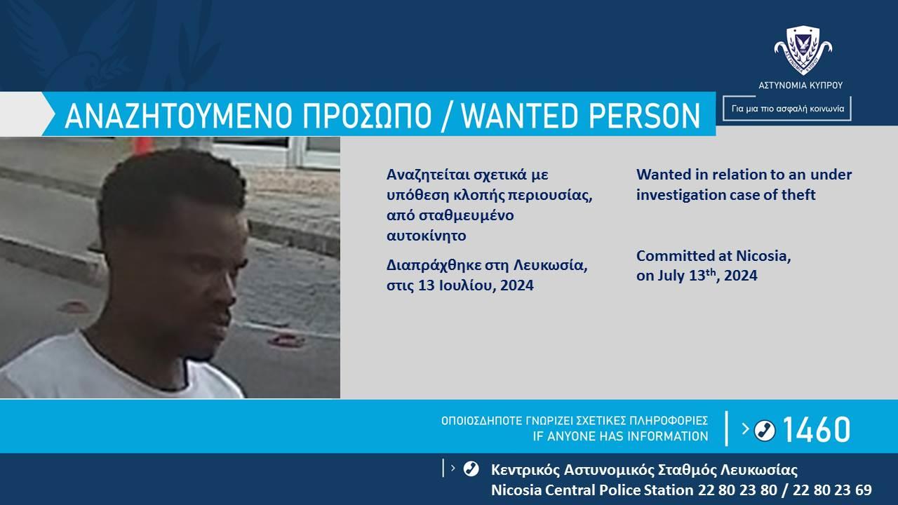 Φωτογραφία υπόπτου προσώπου, που αναζητείται σχετικά με διερευνώμενη υπόθεση κλοπής, δίνει στη δημοσιότητα η Αστυνομία, με σκοπό τη συλλογή πληροφοριών που μπορεί να βοηθήσουν στον εντοπισμό του.
