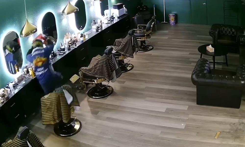 Ο ένας χρησιμοποιεί σφυρί για να σπάσει τη γυάλινη μπροστινή πόρτα, επιτρέποντας στον συνεργό του να εισχωρήσει στο κατάστημα, οπλισμένος με ένα κόκκινο δοχείο βενζίνης.