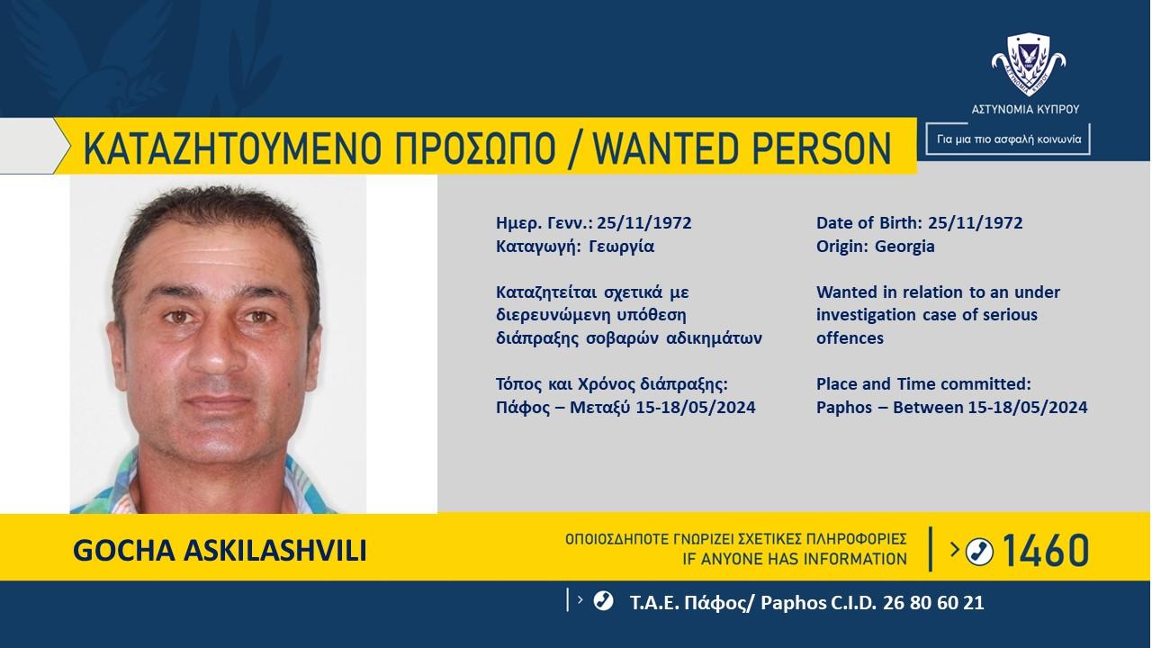 Πρόκειται για τον Gocha Askilashvili, ημερομηνία γέννησης 25/11/1972, από Γεωργία, εναντίον του οποίου έχει εκδοθεί δικαστικό ένταλμα σύλληψης, για σκοπούς διερεύνησης της υπόθεσης.