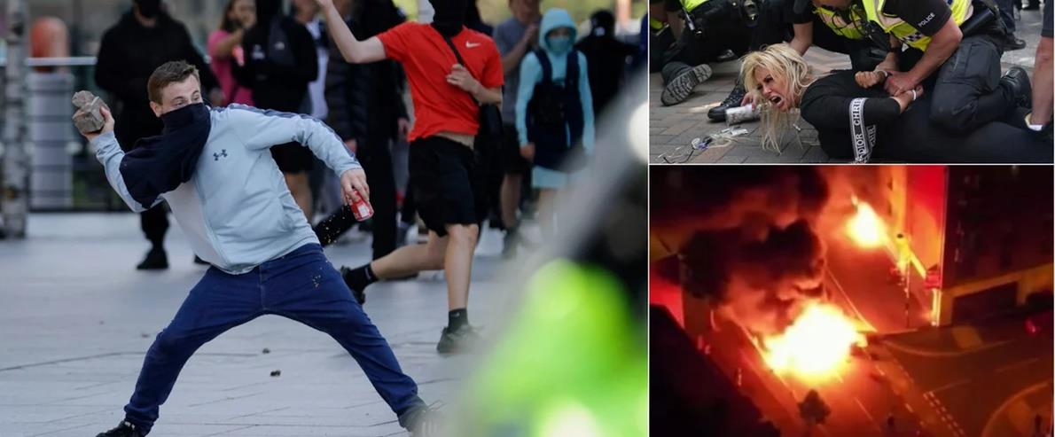 Στο νότιο Μπέλφαστ της Βόρειας Ιρλανδίας – τμήμα και αυτή της Βρετανίας – η αστυνομία ήρθε αντιμέτωπη με ακροδεξιούς κουκουλοφόρους ταραχοποιούς που πετούσαν βόμβες μολότοφ και πέτρες κατά των δυνάμεων καταστολής.