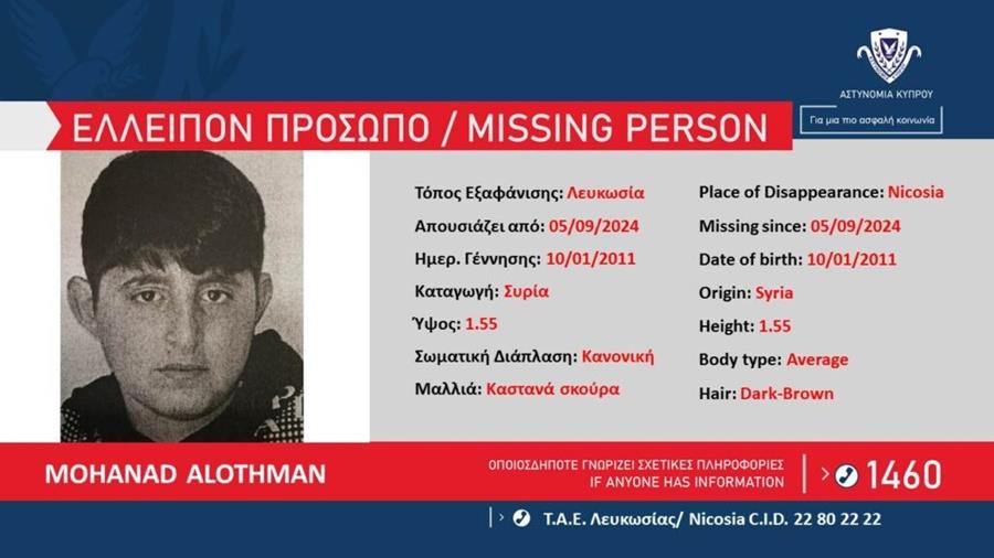 Φωτογραφία και τα στοιχεία ανηλίκου 13 ετών, ο οποίος ελλείπει από τον χώρο διαμονής του στη Λευκωσία, δίνει στη δημοσιότητα η Αστυνομία, με σκοπό τη συλλογή πληροφοριών που μπορεί να βοηθήσουν στον εντοπισμό του.
