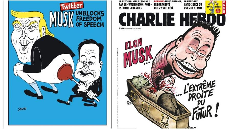 Ενώ στο τελευταίο με αναφορά στο twitter εμφανίζεται από τους σκιτσογράφους του γαλλικού Μέσου να γίνεται ο «ενδιάμεσος» των ακραίων ιδεών του Τραμπ και το μήνυμα αναφέρει: «Twitter - Ο Μασκ ξεμπλοκάρει την ελευθερία του λόγου»