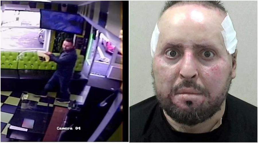 Ο 40χρονος έχει καταγραφεί από κάμερα ασφαλείας να ρίχνει βενζίνη στο κατάστημα και στη συνέχεια να βάζει φωτιά. Ωστόσο, τυλίχθηκε ο ίδιος στις φλόγες. Όταν συνειδητοποίησε τι είχε συμβεί, άρχισε να τρέχει, με έναν περαστικό να τον βοηθάει με έναν πυροσβεστήρα.