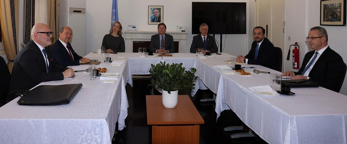 Οι παρόντες: Στο τραπέζι της συνάντησης κάθονται ο Νίκος Χριστοδουλίδης και ο Ερσίν Τατάρ με τους διαπραγματευτές τους και ο Κόλιν Στιούαρτ με τους συνεργάτες του.