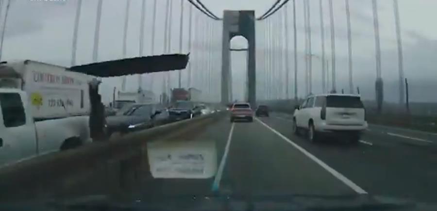 Heart-pounding dashcam video captured a Brooklyn man miraculously dodging death when high winds on the Verrazano-Narrows Bridge sent a wooden board flying off a truck and into his windshield pic.twitter.com/AmLIfzN21K