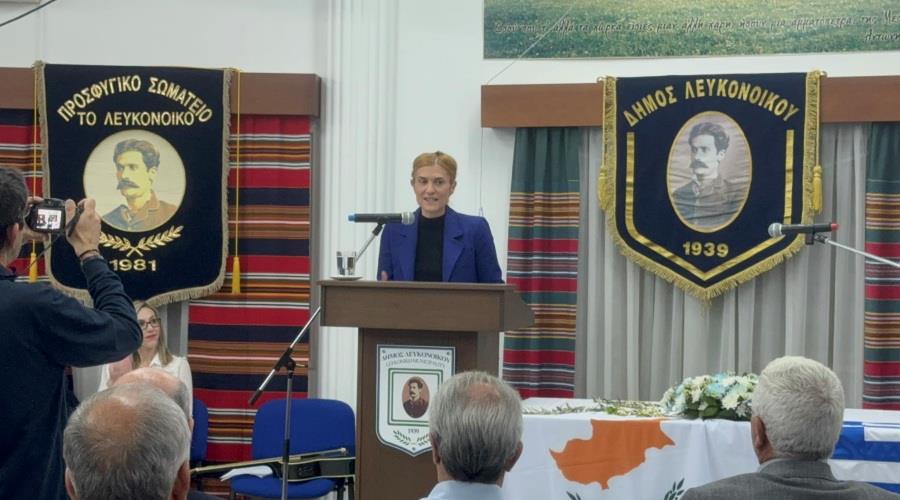Η κ. Αριστοτέλους συνέχισε λέγοντας ότι ο κυπριακός ελληνισμός δεν υπήρξε ποτέ απλός θεατής της Ιστορίας, αλλά ήταν πάντοτε στην πρώτη γραμμή, όπως και το Λευκόνοικο, που στάθηκε διαχρονικά "φλόγα αντίστασης και φάρος αξιοπρέπειας" σε όλες τις σημαντικές στιγμές του ελληνισμού.