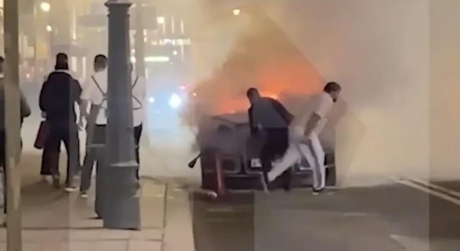 Οι έκπληκτοι θεατές παρακολουθούσαν να βγαίνει μαύρος καπνός από το μπροστινό μέρος του κατεστραμμένου οχήματος, καθώς η φωτιά συνέχιζε να μαίνεται.