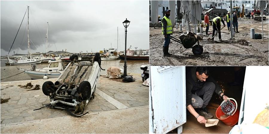 Η θεομηνία που έπληξε την Πάρο το απόγευμα της Κυριακής άφησε πίσω της εικόνες βιβλικής καταστροφής: αυτοκίνητα αναποδογυρισμένα, κάποια κατέληξαν στη θάλασσα, σπίτια πλημμυρισμένα, φερτά υλικά, πέτρες, λάσπες και ξύλα παντού. Οι δρόμοι μετατράπηκαν σε χειμάρρους, τα πεζοδρόμια εξαφανίστηκαν και το άλλοτε γραφικό λιμάνι της Νάουσας έγινε μια τεράστια λασπωμένη λίμνη.
