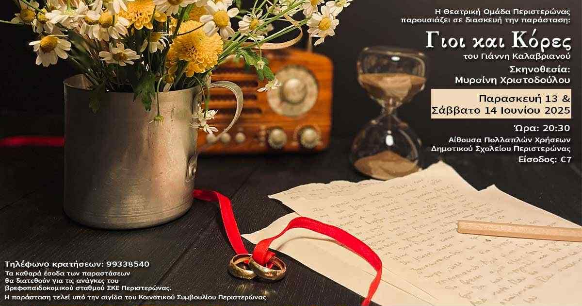 Η βραβευθείσα και διακριθείσα Θεατρική Ομάδα Περιστερώνας επιστρέφει δυναμικά, παρουσιάζοντας σε διασκευή την παράσταση «Γιοι και Κόρες», του Γιάννη Καλαβριανού, μία παράσταση για την αναζήτηση της ευτυχίας.