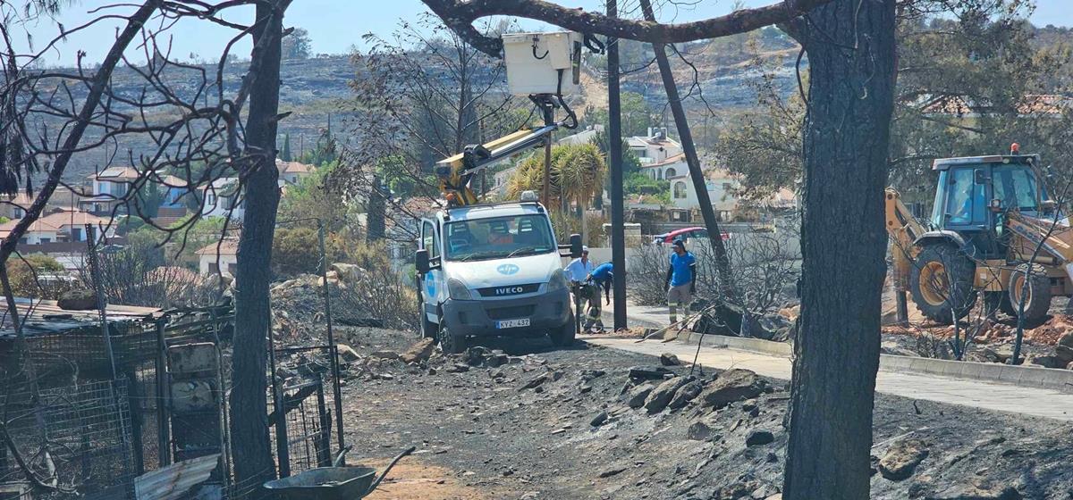 Εν συνεχεία, η εκπρόσωπος Τύπου της ΑΗΚ είπε ότι συνολικά εργάζονται αδιάκοπα 150 άτομα από όλες τις πόλεις. Αναφερόμενη στις ζημιές που υπέστη το δίκτυο της Αρχής, επεσήμανε ότι καταγράφηκαν 500 κατεστραμμένοι πάσσαλοι και 50 μετασχηματιστές, προσθέτοντας ότι μέχρι το βράδυ της Κυριακής, η Αρχή κατόρθωσε να αντικαταστήσει 240 πασσάλους και 10 μετασχηματιστές. Ανέφερε ακόμη ότι κατασκευάστηκαν εννιά χιλιόμετρα εναέριου δικτύου μέσης τάσης προς αντικατάσταση καμένων αγωγών και απομακρύνθηκαν 170 καμένοι πάσσαλοι, οι οποίοι, όπως είπε, είχαν εκτεθεί επικίνδυνα στο έδαφος μετά την πτώση τους λόγω της πυρκαγιάς.