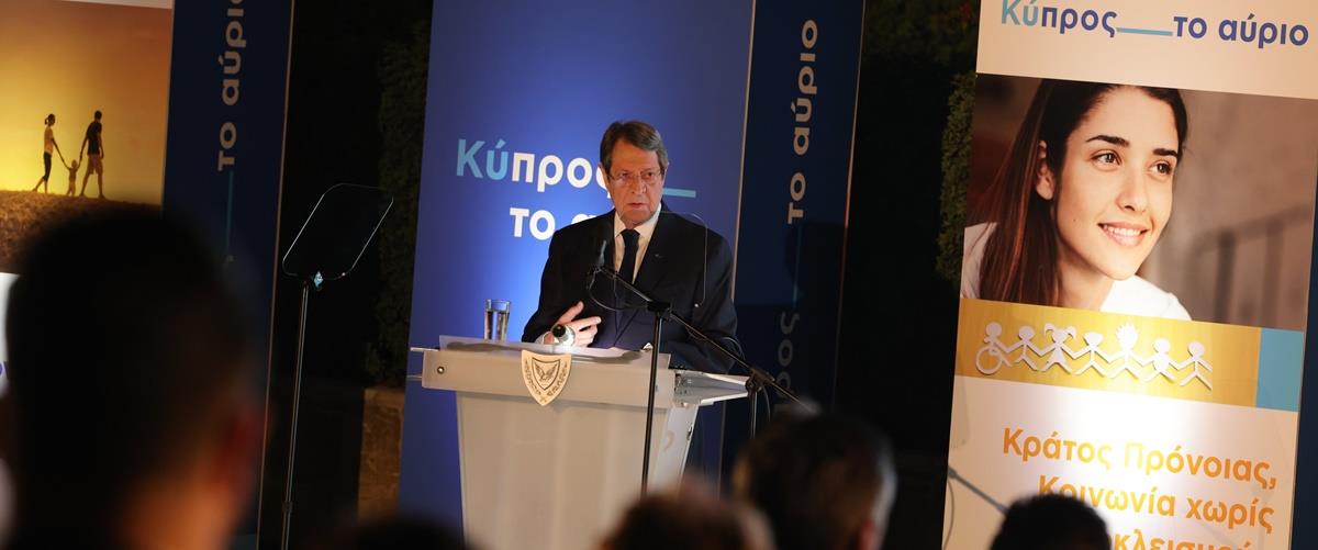Τις πολιτικές που υλοποίησε η Κυβέρνηση, σε συνδυασμό με το Σχέδιο η «Κύπρος-το αύριο», προς την κατεύθυνση οικοδόμησης ενός κράτους πρόνοιας χωρίς αποκλεισμούς, παρουσίασε σε αποψινή εκδήλωση ο Πρόεδρος της Δημοκρατίας, Νίκος Αναστασιάδης.