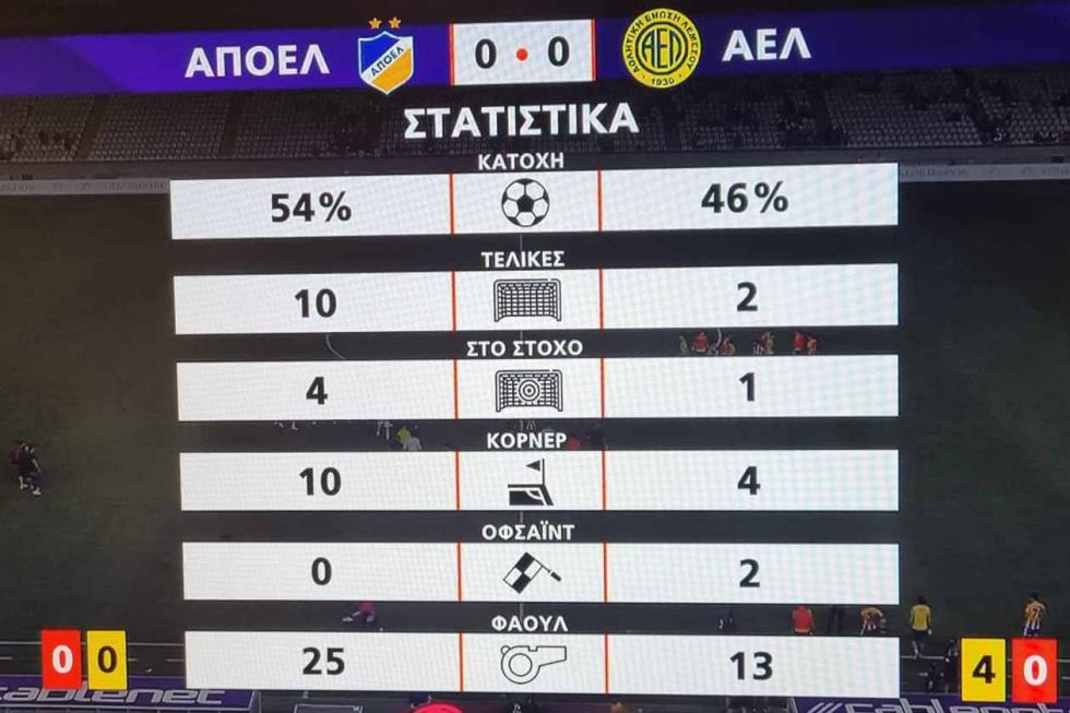 Oι δέκα τελικές με τις τέσσερις στον στόχο για τους γηπεδούχους, έναντι των δυο με τη μια στον στόχο για τους φιλοξενούμενους, λένε ήδη πολλά, για την επικράτεια που είχε στον αγώνα ο ΑΠΟΕΛ, με την κατοχή να ήταν στο 54% έναντι 46% της ΑΕΛ.