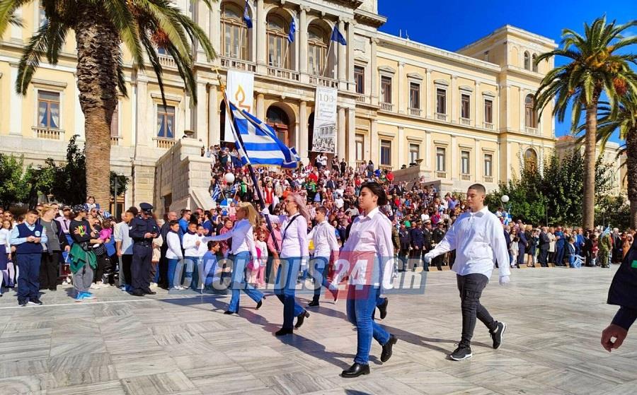 Οι μαθητές εισέπραξαν το χειροκρότημα των επισήμων και του κόσμου που συγκεντρώθηκε στην Πλατεία Μιαούλη για να παρακολουθήσει την παρέλαση, με σύμμαχο τον καλό καιρό, σύμφωνα με το cyclades24.gr.