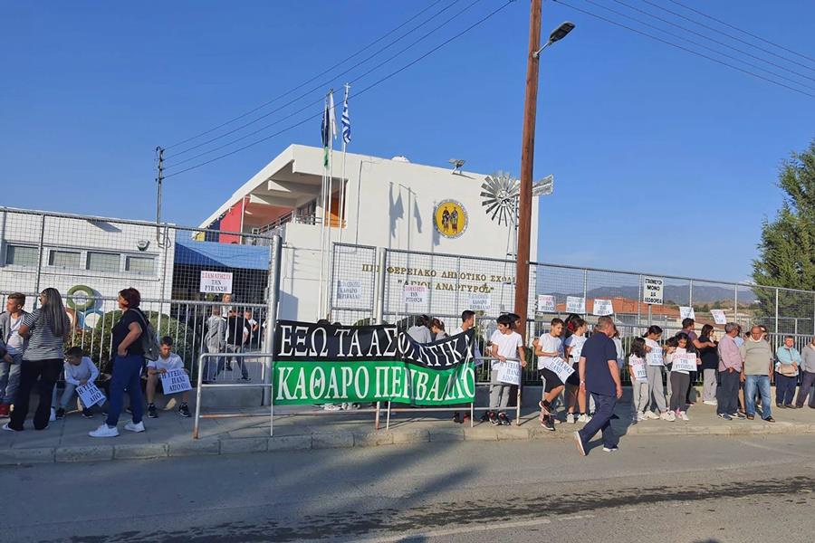 Κρατώντας πανό και πλακάτ, με συνθήματα όπως «Έξω τα ασφαλτικά. Καθαρό περιβάλλον», «Η υγεία μας πάνω από όλα» και «Σταματήστε τη ρύπανση», οι διαμαρτυρόμενοι συγκεντρώθηκαν στην είσοδο του δημοτικού σχολείου Αγίων Αναργύρων Μονής – Μοναγρουλλίου.