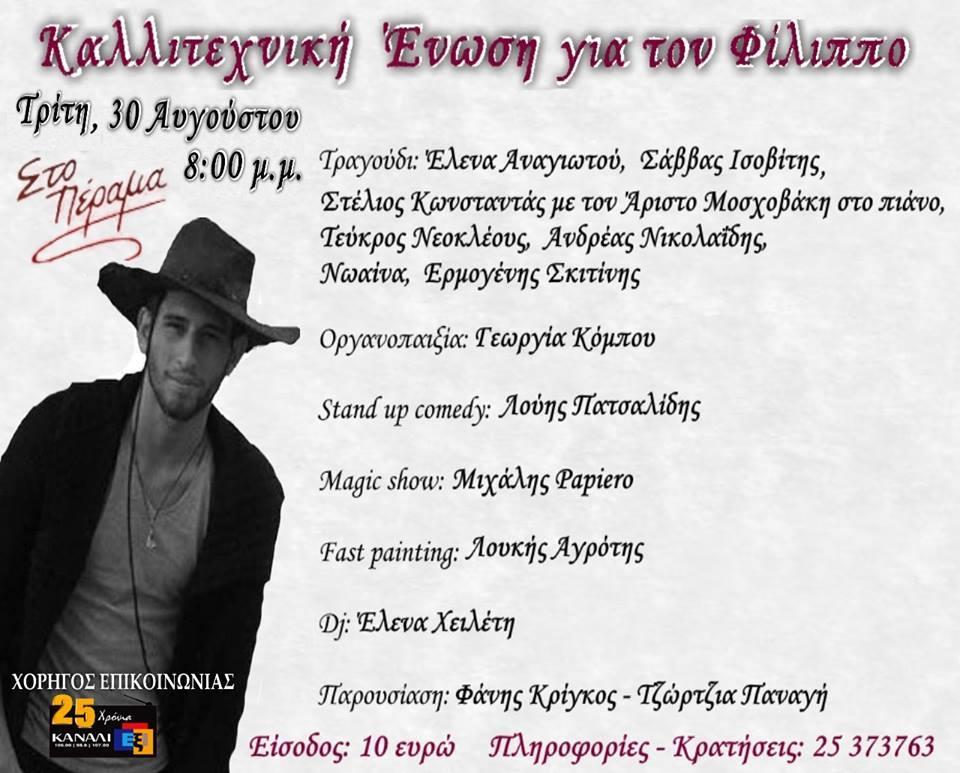 Για τον λόγο αυτό, ο δημοσιογράφος Φάνης Κρίγκος διοργανώνει μια εκδήλωση όπου όλοι οι καλλιτέχνες συμμετέχουν αφιλοκερδώς και όλα τα έσοδα θα διατεθούν στον 20χρονο συνάνθρωπο μας.