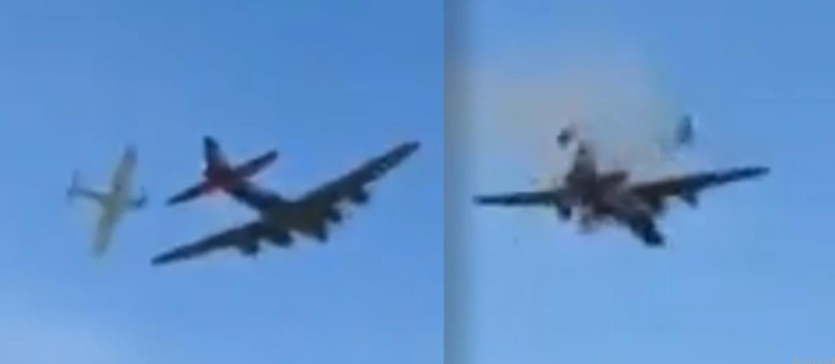 Όπως φαίνεται στο βίντεο ένα μεγάλο B-17 (βομβαρδιστικό από την εποχή του Β’ Παγκοσμίου Πολέμου) κινείται στον αέρα όταν ένα μικρότερο μονοθέσιο αεροσκάφος Bell P-63 Kingcobra πέφτει πάνω του με αποτέλεσμα να συγκρουστούν.