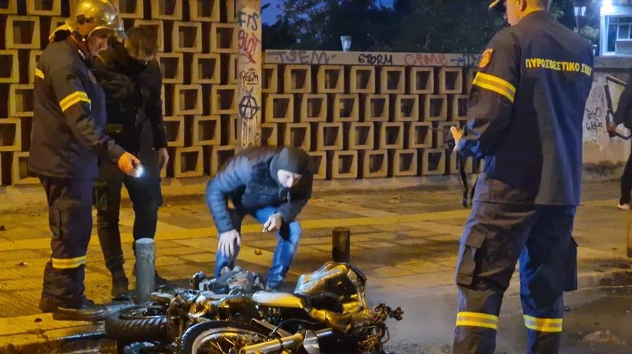 Μολότοφ σε υπηρεσιακή μοτοσικλέτα της Αστυνομίας, έριξαν κουκουλοφόροι, περίπου στις 17.30, λίγο πριν ξεκινήσει η πορεία για την επέτειο του Πολυτεχνείου στη Θεσσαλονίκη.